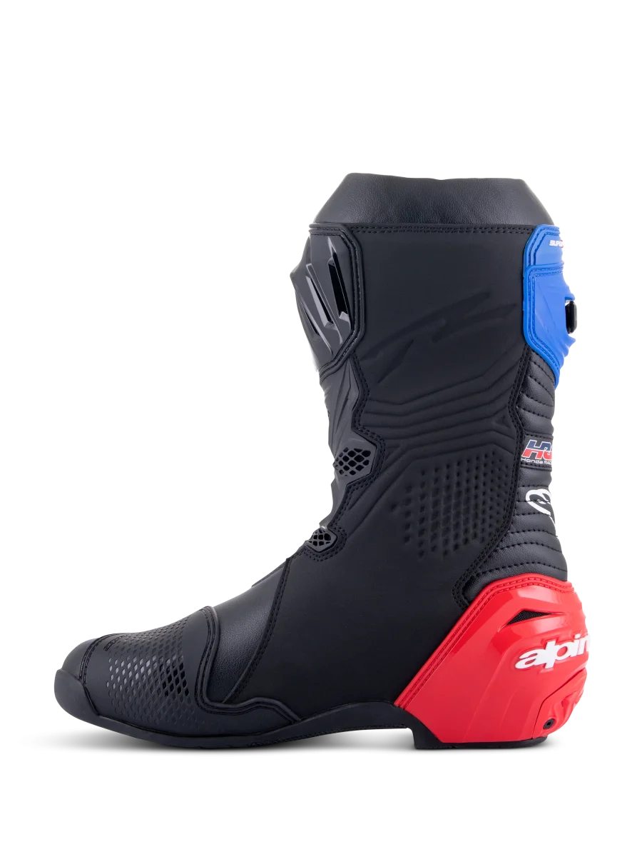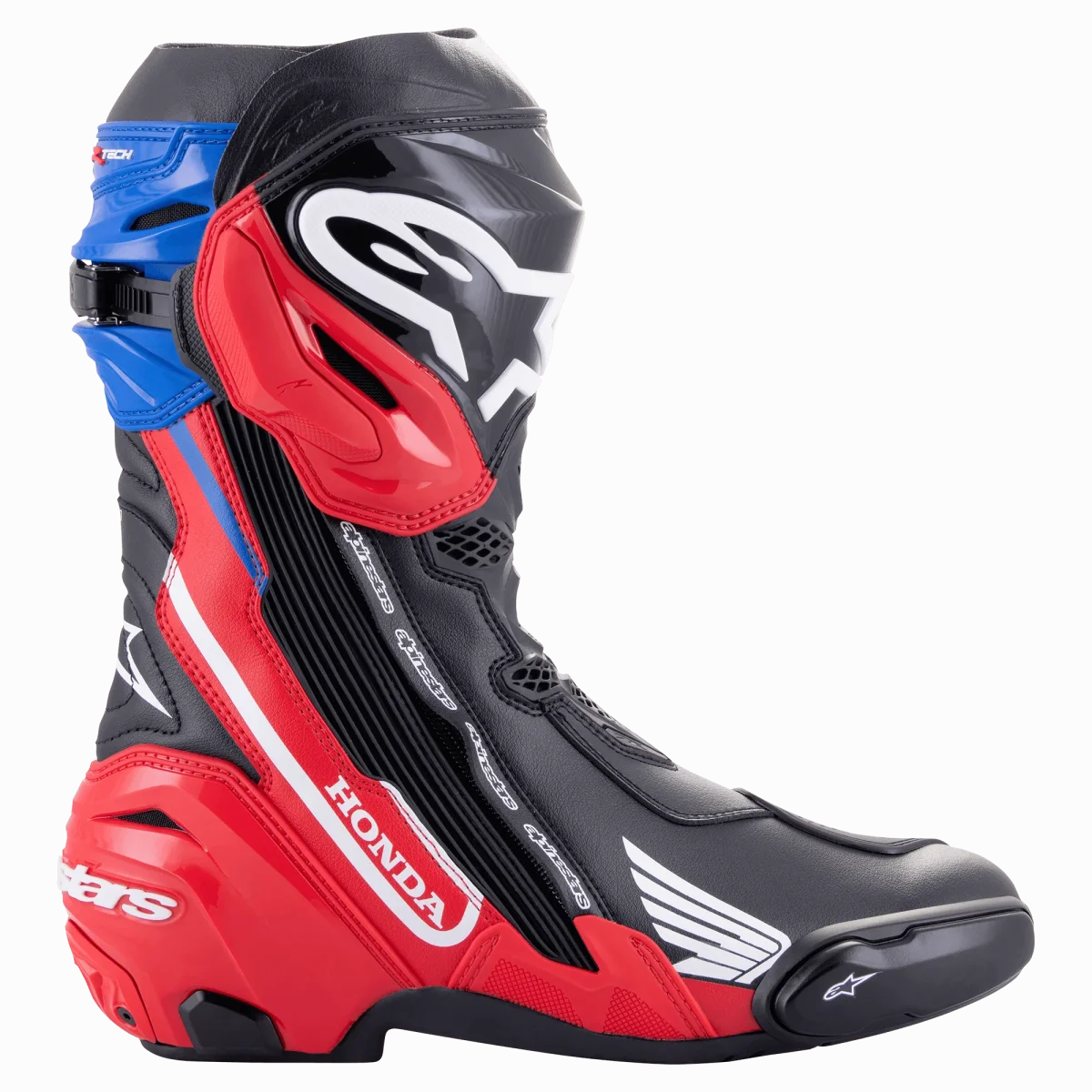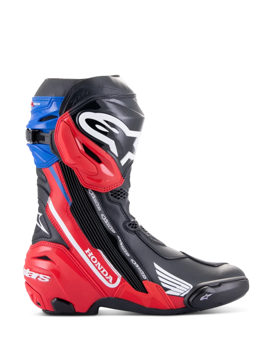 Presentadas en 2023 y diseñadas para pilotos de carretera y circuito, las Botas Honda Supertech R ofrecen control y protección de competición. Certificadas CE EN 13634:2017, combinan microfibra con placa de espinilla y deslizadores de TPU, deslizadores de puntera coinyectados TPU/aluminio y botín interior biomecánico 3D. La suela de goma ligera, el collarín microajustable y la cremallera elástica mejoran el ajuste y el agarre en estribos bajo lluvia.