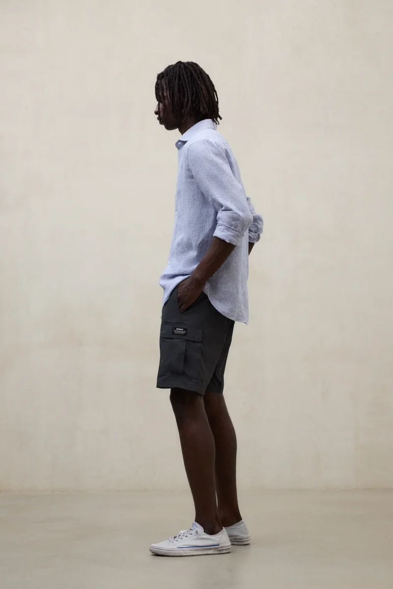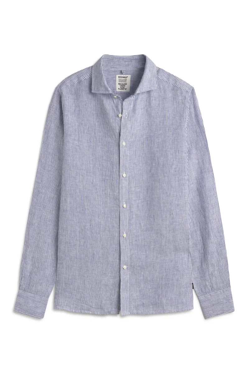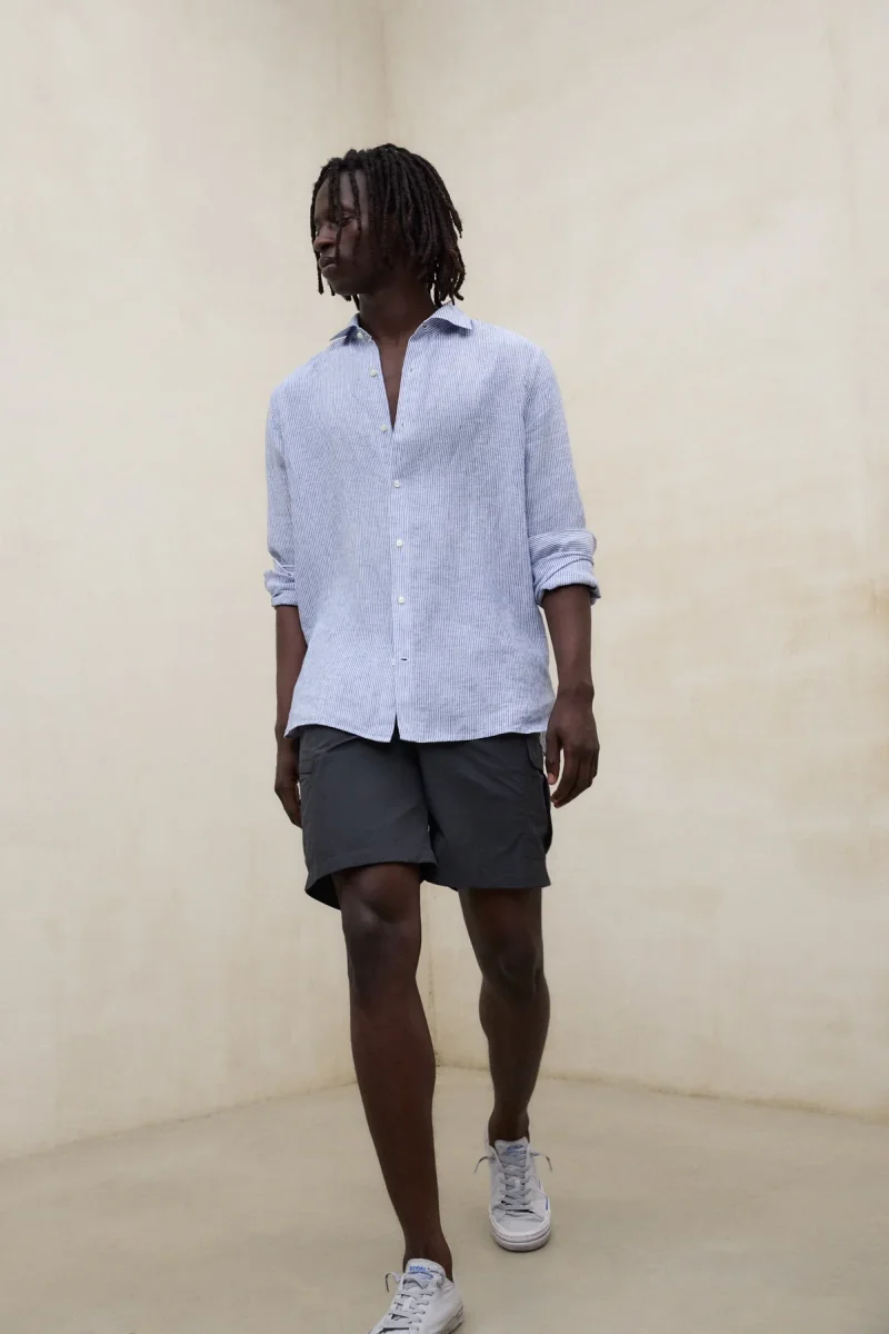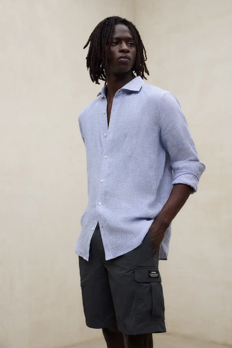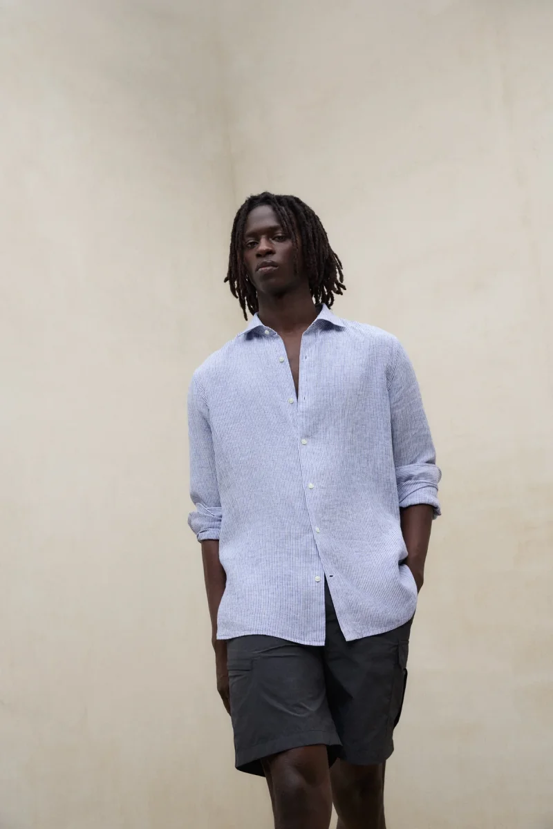 La Camisa Alfredo de Lino a rayas está fabricada con un tejido principal de 100% Lino. Tapeta central delantera con cierre de botones. Abertura en la manga con cierre de botón.