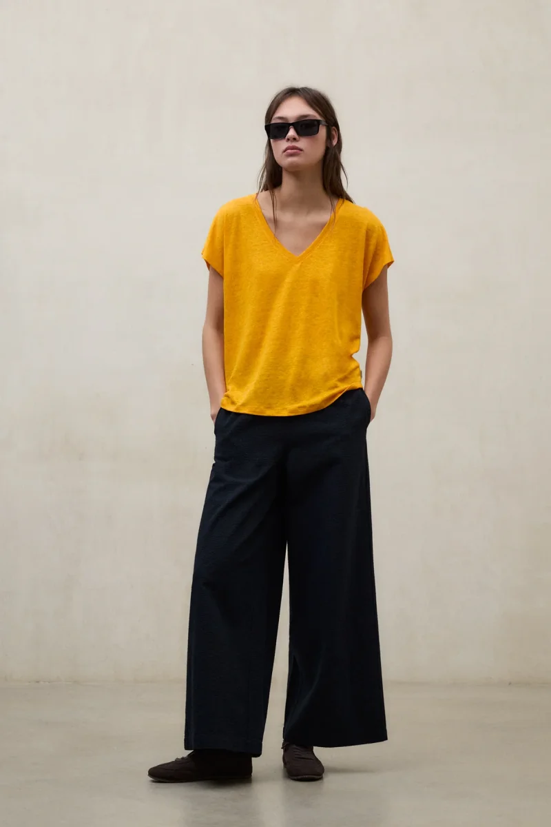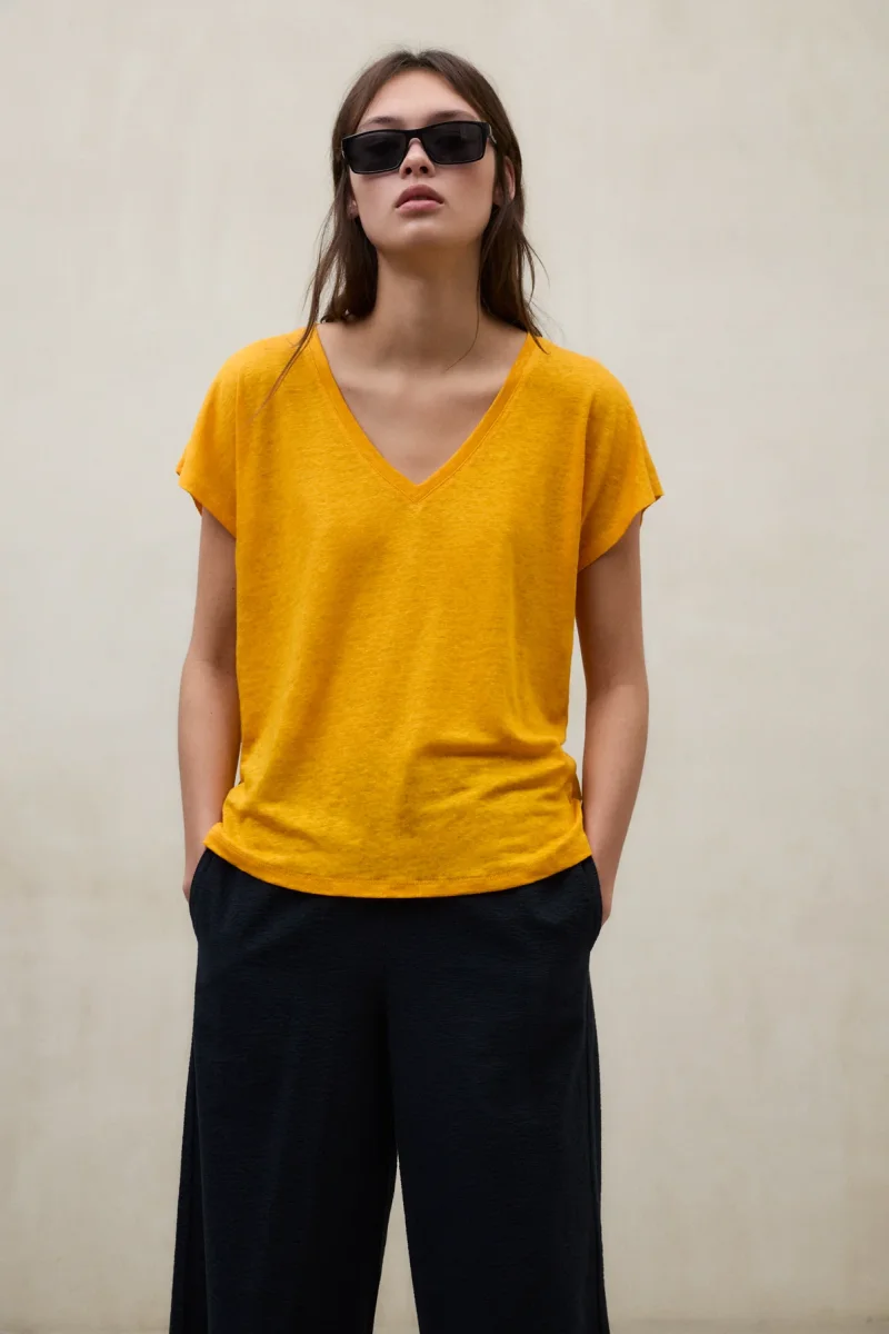 La Camiseta Arendal está fabricada con un tejido principal de 100% Lino. Fit relajado. Escote en V y manga corta.