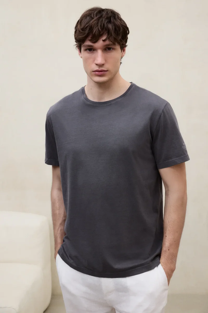 La Camiseta Vent está fabricada con un tejido principal de 100% Algodón reciclado. Fit regular. Cuenta con cuello redondo de canalé. Estampado de marca en la manga izquierda. Teñida y lavada en prenda.