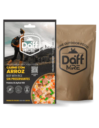 Carne con Arroz en formatos pouch de 260 grs. Alimento práctico para transportar en tu mochila o equipaje, y fácil de manipular al momento de consumir el contenido, gracias a su envase doypack que puedes apoyar de forma vertical sobre cualquier superficie. No requiere refrigeración, es de larga duración y muy fácil de calentar. Opciones para Calentar: Baño María. Calentador Autónomo Daff. (10-12 minutos) Ingredientes: Agua, carne de vacuno, arroz, aceite vegetal refinado de maravilla, zanahoria, choclo, arvejas, cebolla, condimento carbonada de carne, ajo en polvo, sal. Información Nutricional: