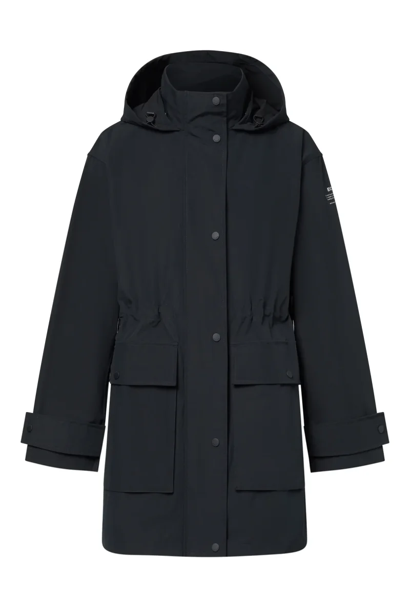 La Chaqueta Cova está fabricada con un tejido principal de 54% Poliéster reciclado. Fit relajado. Largo por encima de la rodilla. Cuenta con cuello alto, tapeta frontal con cremallera oculta y broches, capucha desmontable y bolsillos frontales de parche.