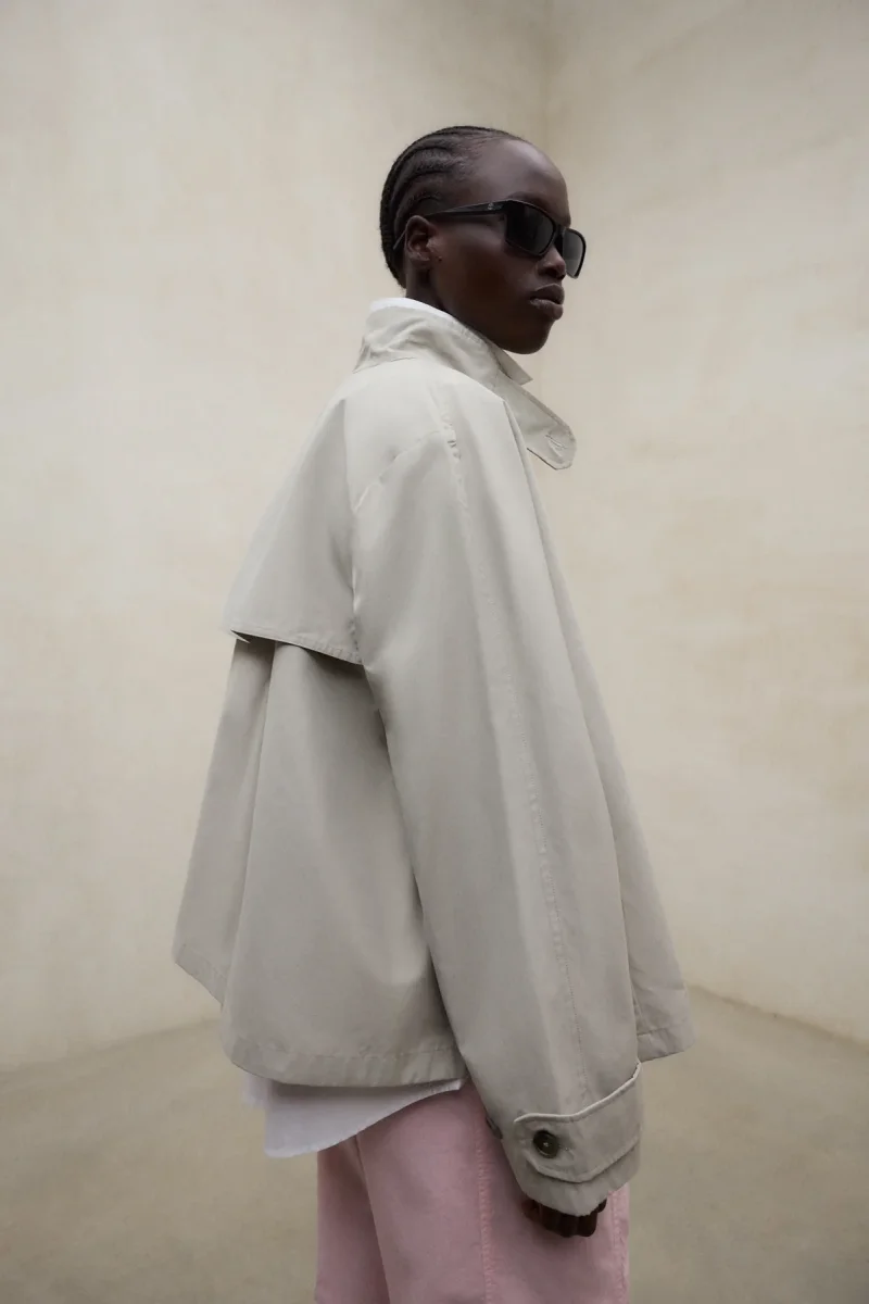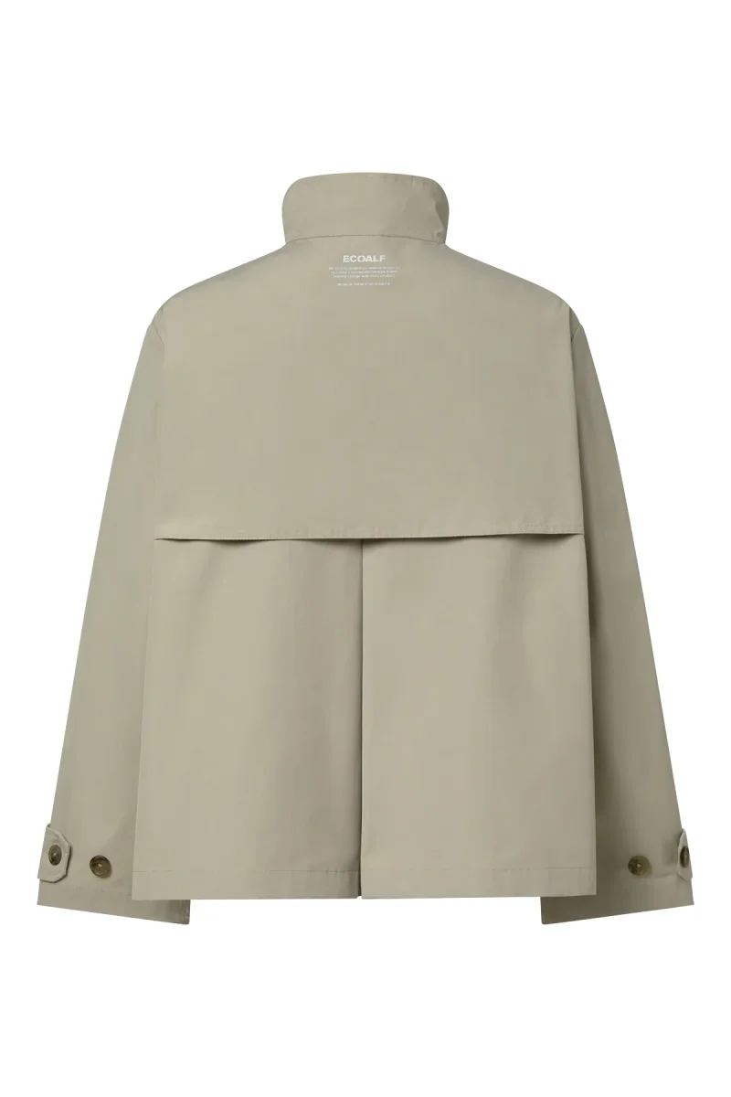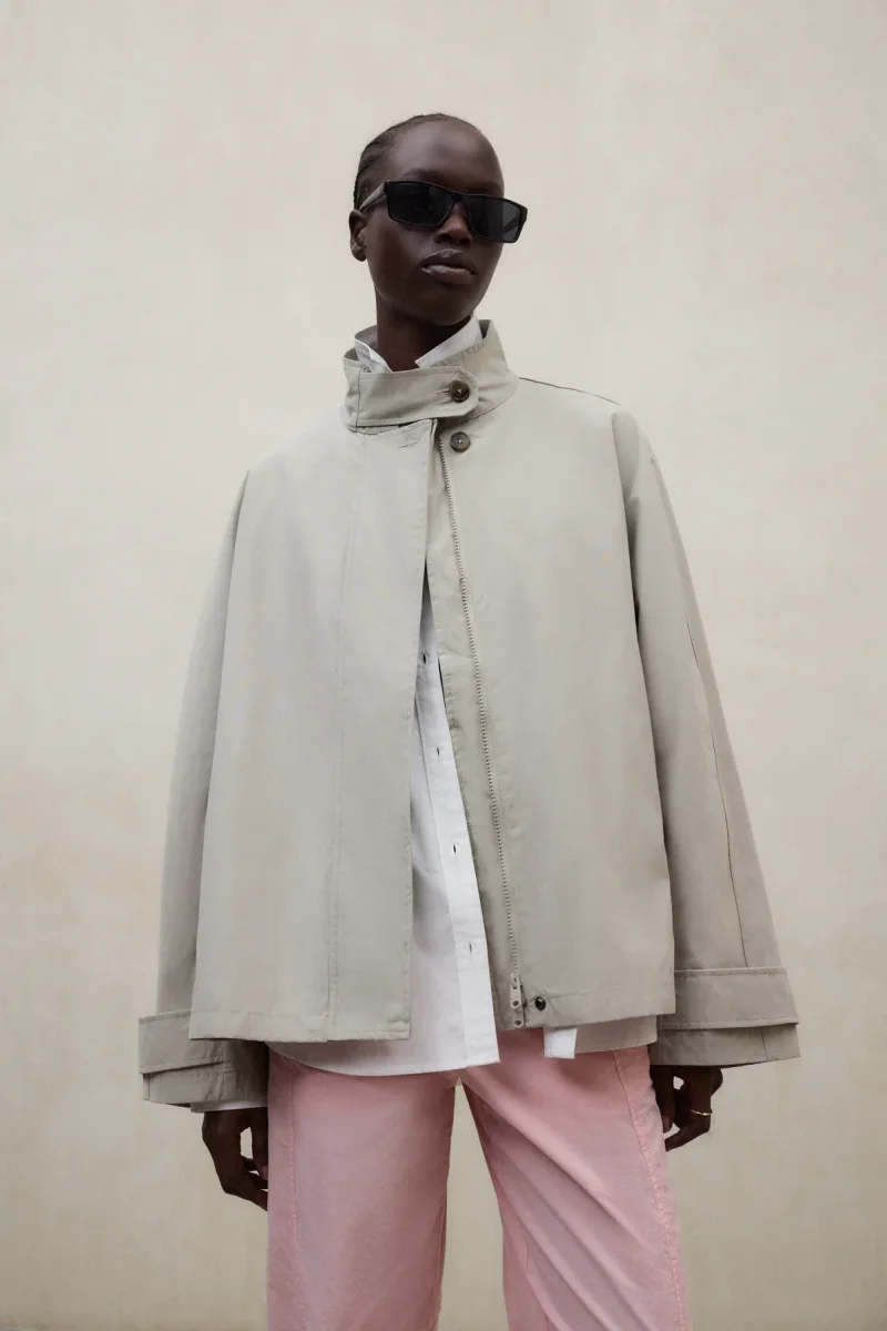 La Chaqueta Nebu está fabricada con un tejido principal de 54% Poliéster reciclado. Fit oversize. Cuello alto con cierre de botón. Bolsillos laterales. Puños ajustables. Pliegue en la espalda.