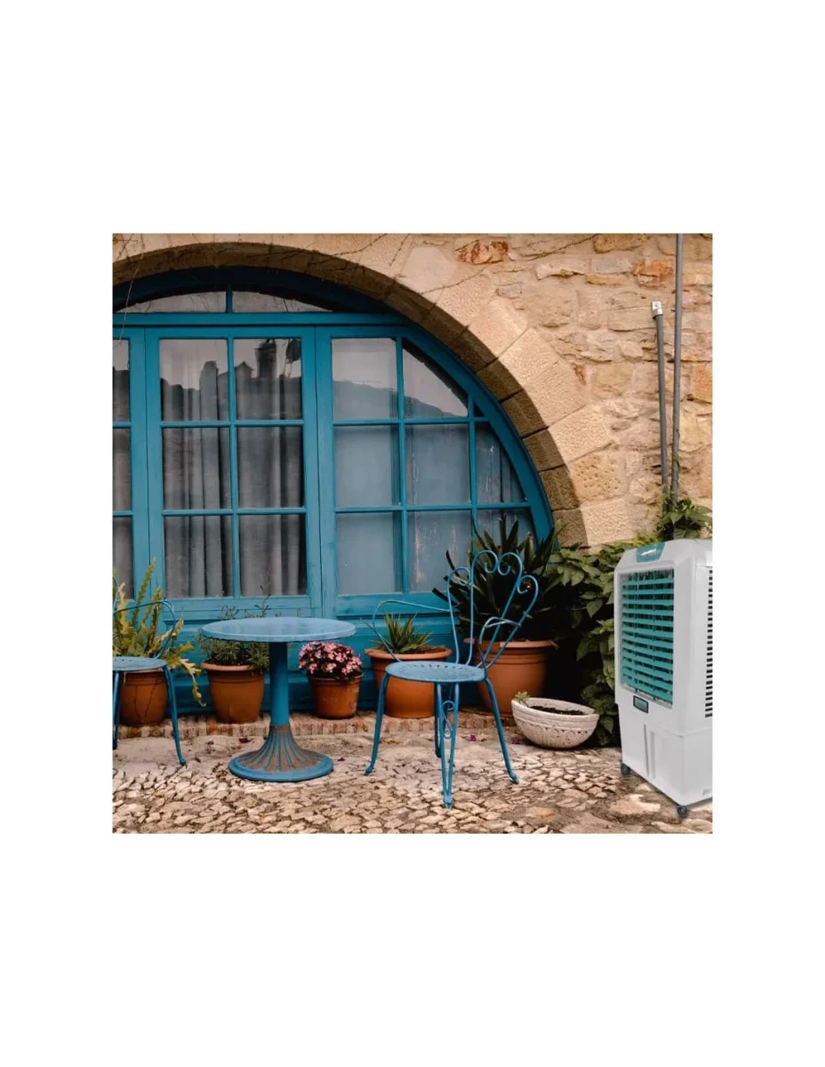 - Enfriamiento Potente y Eficaz: Utiliza un sistema de evaporación de agua para bajar rápidamente la temperatura en grandes áreas exteriores.