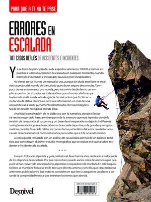 Errar es humano. Pero cuando practicas un deporte de riesgo, errar es algo más, es jugarte tu seguridad y la de tus compañeros. Por eso este manual, que se llama así «Errores en escalada», se va a convertir pronto en el mejor aliado de los escaladores, sea cual sea la disciplina que practiquen. Joaquín Colorado ha puesto sus 30 años de experiencia como docente y como profresional de la escalada en este manual, y nos propone 101 experiencias, 101 errores vividos o estudiados por él. Y lo mejor, combina lo didáctico con lo narrativo para crear una historia «ejemplar» a partir de la cual analizar el error y proponer soluciones. Fácil de leer, fácil de comprender, entretenido y práctico. Un manual que nos enganchará desde el primer «error».