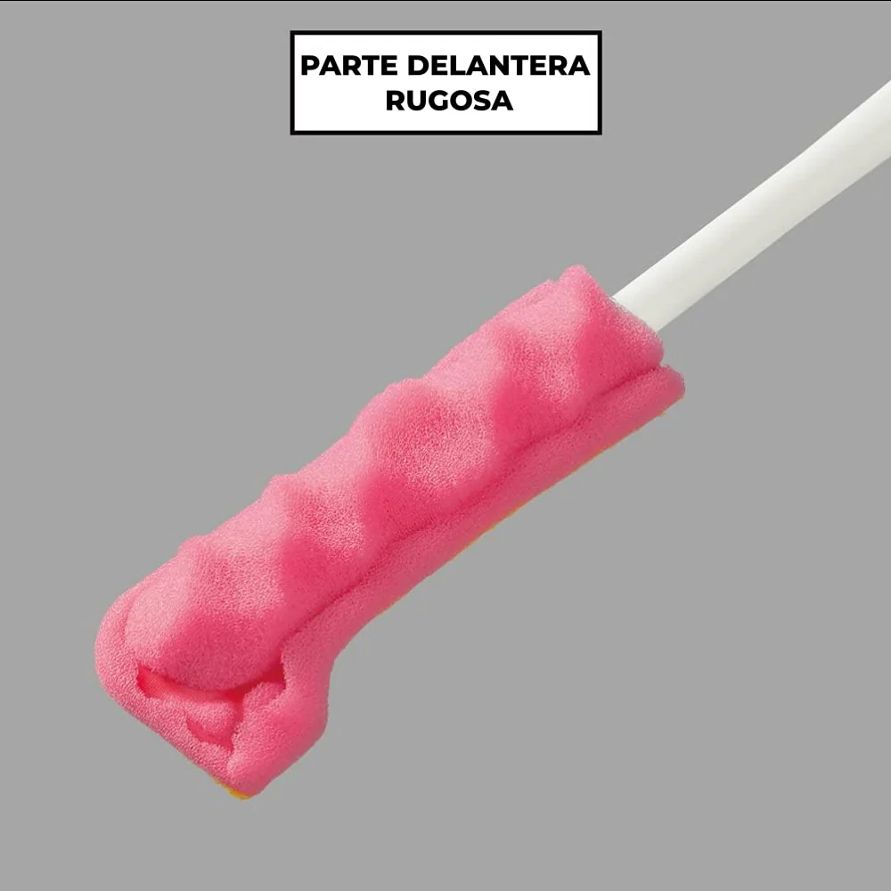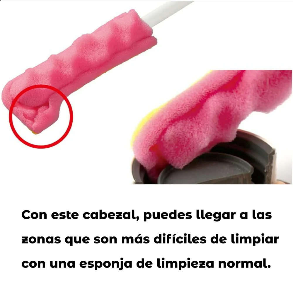 - Para poner la nueva esponja, mójala con detergente, sostenla e inserta suavemente la punta del mango.