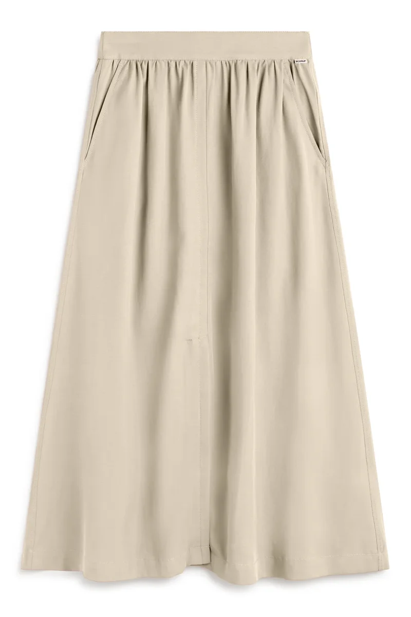 La falda Yoko, hecha de 97% TENCEL™ Lyocell. Estas fibras provienen de pulpa de madera de bosques certificados, y se producen mediante procesos de circuito cerrado que cumplen con los estándares ambientales más exigentes. Presenta una silueta en A que favorece la figura. Con bolsillos y aberturas delanteras y traseras, es una opción elegante y práctica que aporta un toque diferente a cualquier outfit.