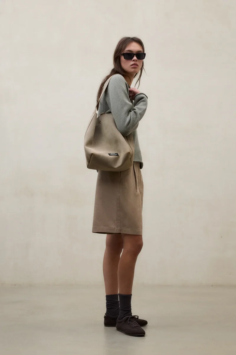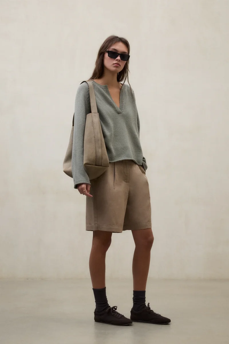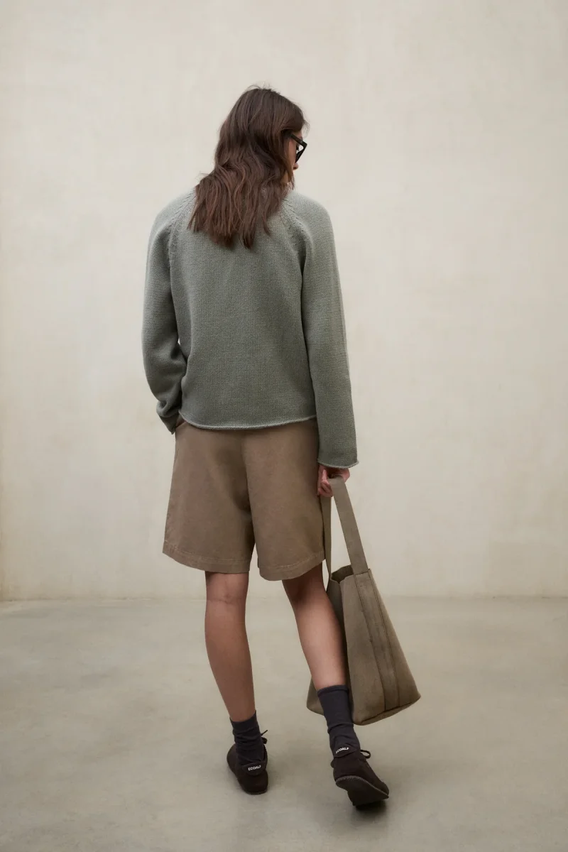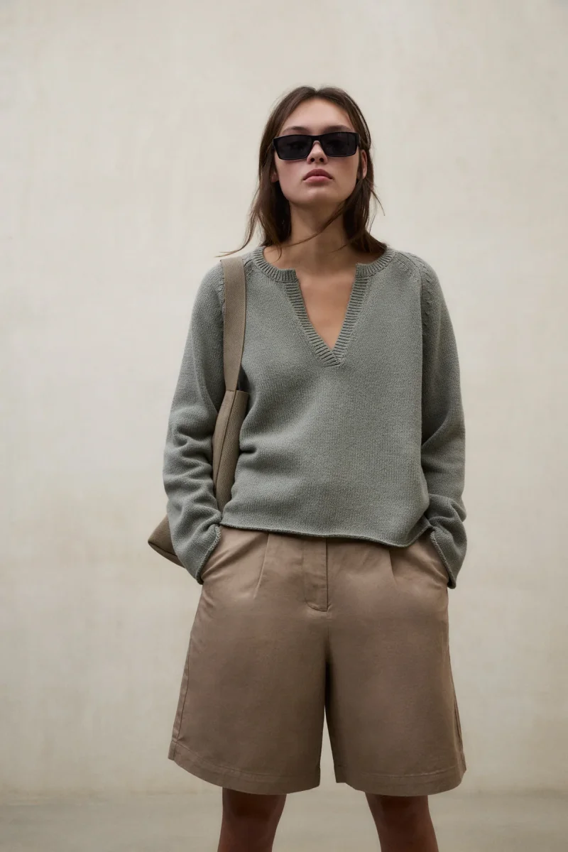 El Jersey Nour está fabricado con un tejido principal de 100% Algodón reciclado. Fit oversize. Mangas raglán y abertura frontal.