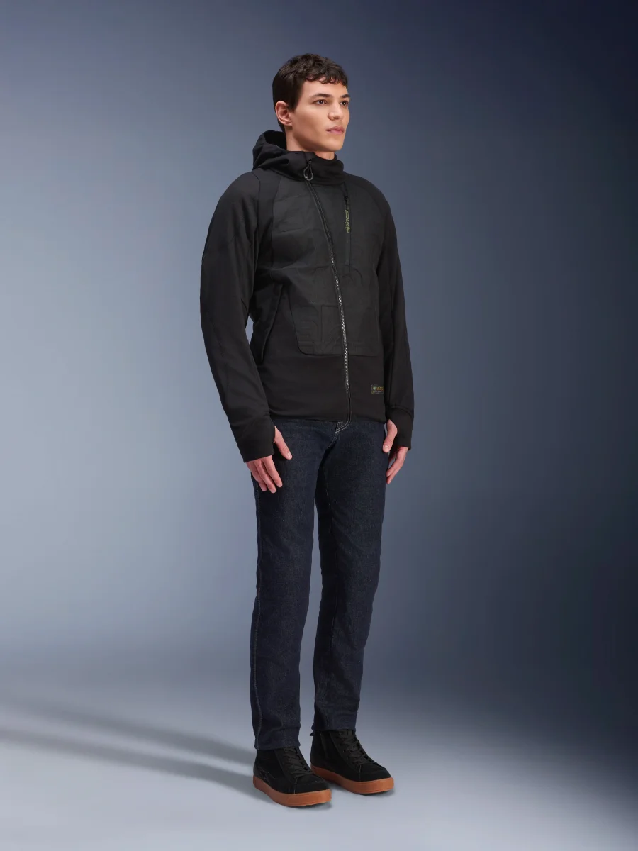 La chaqueta híbrida con capucha MO.ST.EQ (Moto Streetwear Equipment) es una sudadera con capucha acolchada para entretiempo con un diseño que garantiza a la vez el estilo y la comodidad del motorista. La chaqueta con capucha híbrida MO.ST.EQ presenta un chasis elástico en 4 direcciones con inserciones acanaladas estratégicamente ubicadas en el pecho, los costados, los hombros y la parte interna de los codos. En el pecho y la espalda, la MO.ST.EQ tiene paneles sin costuras y ligeramente acolchados. La característica diferencial de esta sudadera con capucha es su cremallera principal frontal ligeramente inclinada, que ofrece una gran comodidad en el cuello incluso cuando está completamente cerrada. Para garantizar la protección, la chaqueta con capucha híbrida MO.ST.EQ tiene protectores Nucleon Flex Plus de nivel 1.