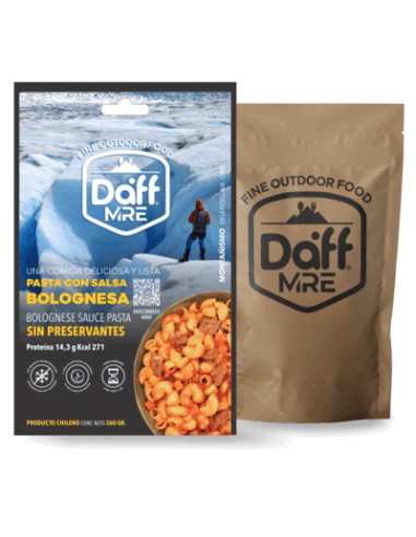 Pasta con Salsa Bolognesa en formatos pouch de 260 grs. Alimento práctico para transportar en tu mochila o equipaje, y fácil de manipular al momento de consumir el contenido, gracias a su envase doypack que puedes apoyar de forma vertical sobre cualquier superficie. No requiere refrigeración, es de larga duración y muy fácil de calentar. Opciones para Calentar: Baño María. Calentador Autónomo Daff. (10-12 minutos) Ingredientes: Agua, pasta, concentrado de tomate, carne de vacuno, zanahoria, cebolla, aceite vegetal refinado de maravilla, sal, azúcar, orégano. Información Nutricional: