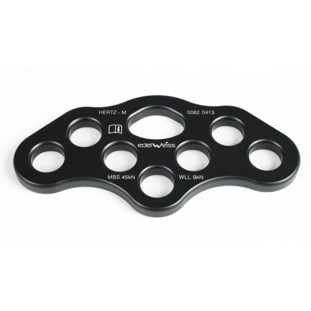 La placa de montaje HERTZ M tiene un diseño suave, ideal para eslingas textiles. Equipado con un punto de conexión principal y siete orificios adicionales de 20 mm, puede recibir conectores industriales grandes, como los mosquetones de automáticos trifásicos.