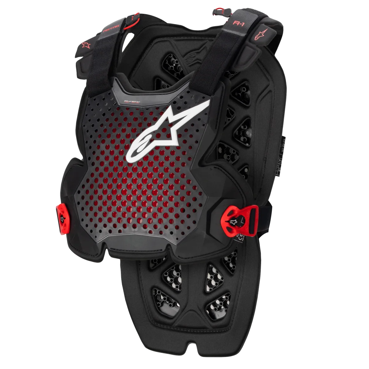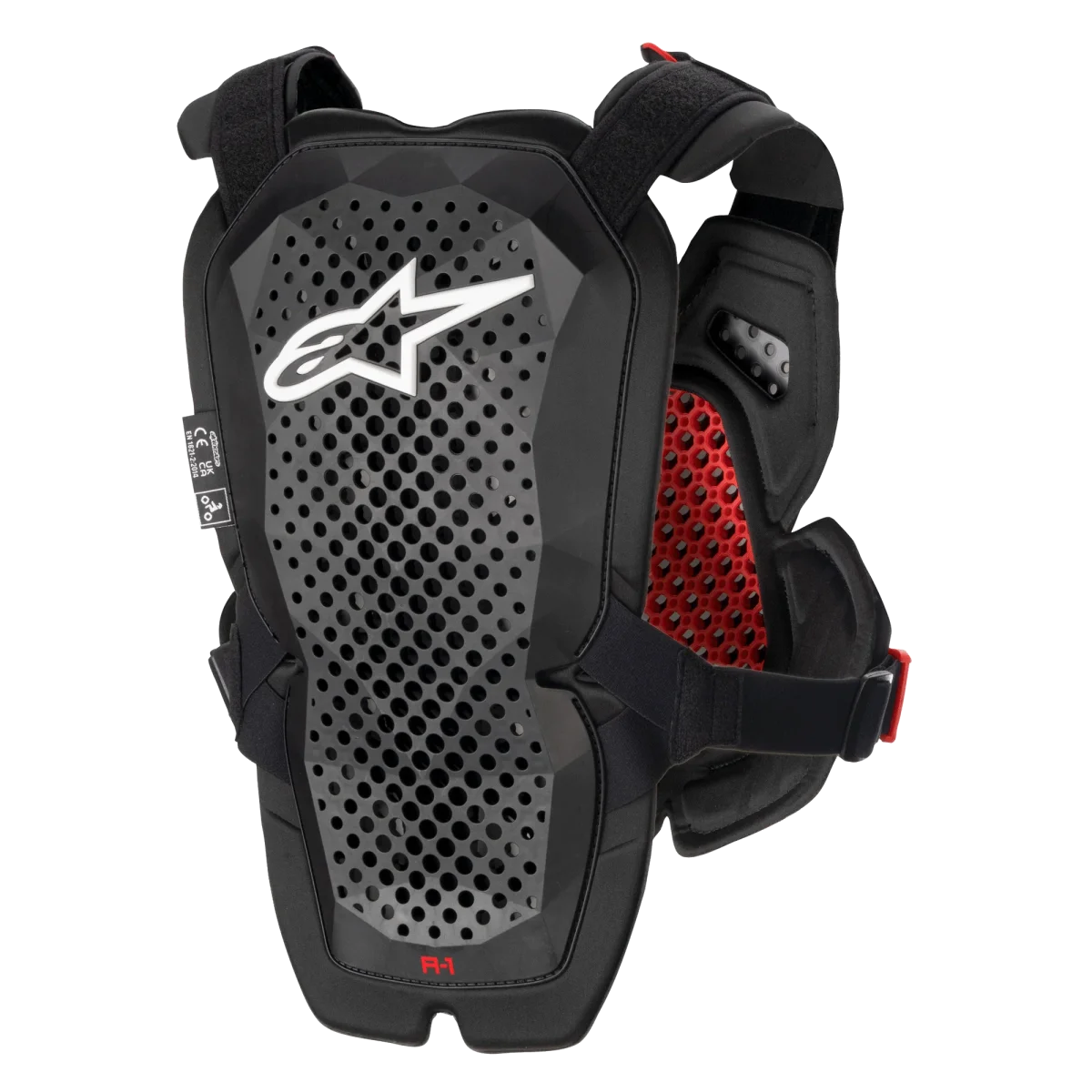 El Protector de Pecho A-1 cuenta con un protector de pecho de Tecnología Híbrida de Poliedro de Nivel 1 CE y UKCA Certificado y un protector de espalda de Tecnología de Poliedro que ofrece niveles insuperables de ventilación, es súper ligero y brinda una excelente protección para la parte superior del cuerpo contra impactos.