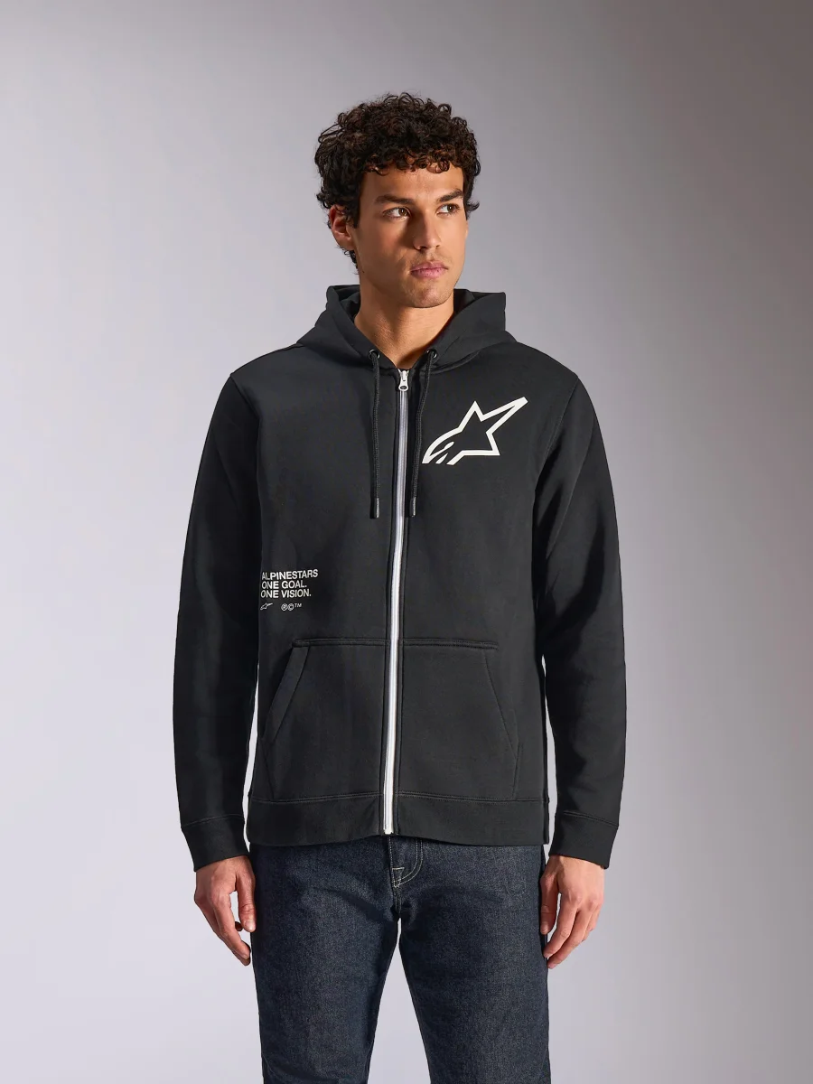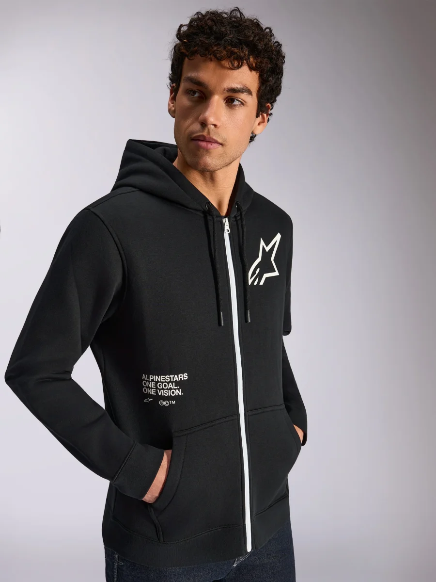 • Sudadera con capucha y cremallera frontal• Cuerpo y mangas con cremallera sólida en la parte delantera• Logo frontal de Astars con impresión One Goal y logo de palabra Alpinestars en la parte trasera• Forro de capucha del mismo material, puntas de cordón sumergidas, puños y dobladillo de canalé• Etiqueta principal interna